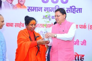 देहरादून; मुख्यमंत्री पुष्कर सिंह धामी ने मुख्यमंत्री आवास के मुख्य सेवक सदन, में समान नागरिक संहिता लागू करने पर आयोजित सम्मान समारोह में प्रतिभाग किया। समारोह में मुख्यमंत्री पुष्कर सिंह धामी ने कहा कि यह सम्मान उत्तराखंड की जनता का सम्मान है। राज्य की जनता के आशीर्वाद से ही उत्तराखंड में समान नागरिक संहिता का सपना साकार हो पाया। उन्होंने कहा समान नागरिक संहिता लागू कर राज्य सरकार ने बाबासाहेब भीमराव अंबेडकर को सच्ची श्रद्धांजलि देने का काम किया है। मुख्यमंत्री ने कहा यू.सी.सी लागू होने के बाद अब राज्य में सभी नागरिकों के अध्किार समान हो गए हैं। यू.सी.सी ने समाज में भेदभाव खत्म करने का काम किया है।