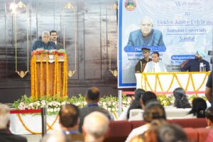 उन्होंने कहा कि शिक्षकों की भूमिका राष्ट्र निर्माण में सर्वाधिक महत्वपूर्ण है। वे केवल ज्ञान नहीं देते, बल्कि व्यक्तित्व गढ़ते हैं, नेतृत्व को जन्म देते हैं और विचारों में संस्कारों का सिंचन करते हैं। शिक्षकों का कार्य केवल पाठड्ढक्रम की पूर्ति तक सीमित नहीं होना चाहिए, बल्कि उन्हें शोध और अध्यापन दोनों में दक्ष होना चाहिए, तकनीक का समुचित उपयोग करना चाहिए, विद्यार्थियों को मूल्य आधारित विचारधारा से जोड़ना चाहिए और उनमें ‘राष्ट्र प्रथम’ की भावना उत्पन्न करनी चाहिए। उन्होंने विश्वविद्यालय के शैक्षणिक और प्रशासनिक समुदाय के प्रयासों की सराहना करते हुए कहा कि यह स्वर्ण जयंती केवल उत्सव नहीं, बल्कि आत्ममंथन, संकल्प और पुनर्निर्माण का अवसर है।