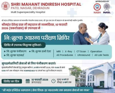 देहरादून। दरबार श्री गुरु राम राय महाराज के सज्जादे गद्दी नशीन एवं श्रीमहंत देवेन्द्र दास महाराज के जन्मदिवस (प्रकटोत्सव 10 फरवरी) के पावन अवसर पर श्री महंत इन्दिरेश अस्पताल, देहरादून द्वारा 10 फरवरी 2026 (मंगलवार) को एक विशाल निःशुल्क स्वास्थ्य परीक्षण शिविर का आयोजन किया जा रहा है, जिसे इस वर्ष सेवा दिवस के रूप में श्रद्धा, सेवा और समर्पण की भावना के साथ मनाया जाएगा। इस शिविर में जनरल चिकित्सा सेवाओं के साथ-साथ सभी सुपरस्पेशलिटी सेवाएं भी पूर्णतः निःशुल्क उपलब्ध कराई जाएंगी। शिविर के लिए पंजीकरण सुबह 08 बजे से प्रारंभ होगा, जबकि मरीज सुबह 09 बजे से दोपहर 03 बजे तक स्वास्थ्य सेवाओं का लाभ ले सकेंगे।